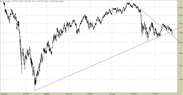 Indeks WIG20 miał wczoraj ważny dzień. Wybił się dołem z trendu bocznego, w którym przebywał od września. Daje mu czas do końca tygodnia na to, aby powrócić powyżej 2200, wtedy będzie można uznać, że to był wypadek przy pracy, czasami na giełdzie tak się zdarza. Ale jeśli nie wrócimy szybko ponad 2200, to...